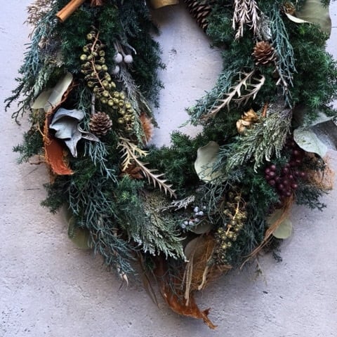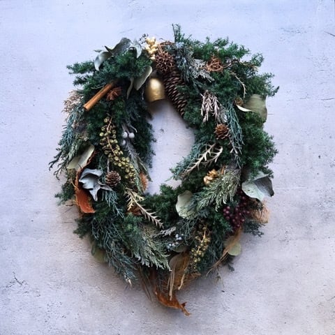 クリスマスのおもてなしの主役で、毎年定番のフレッシュグリーンをたっぷり使ったオーバル型のクリスマスリース作りです。