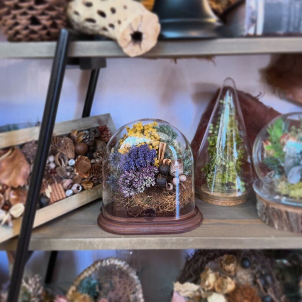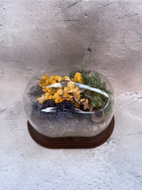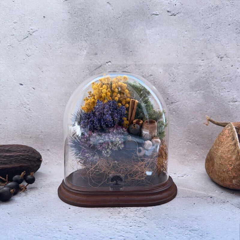 春の光をまとったミモザと、穏やかな香りのラベンダーなどのドライフラワーをぎゅっと閉じ込めたドライテラリウム作りです。